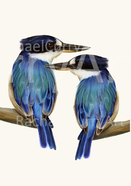 Two Forest Kingfishers. Bird Art Print. Beautiful bird gift, great gift for bird lovers! Vibrant blue, this detailed drawing will bring a joyful colour to your home decor. Free domestic postage.